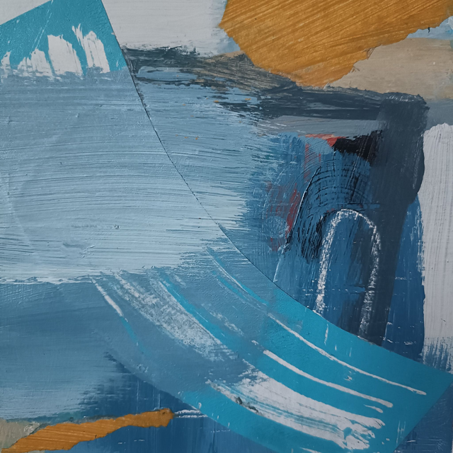 The painting is acrylic, collage and oil stick on paper and framed in this box frame, which can either be presented with the painting up to the surface of the frame or sat back 'in the box' using a 'spacer'. This is very easily changed at any time to suit your setting and choice.