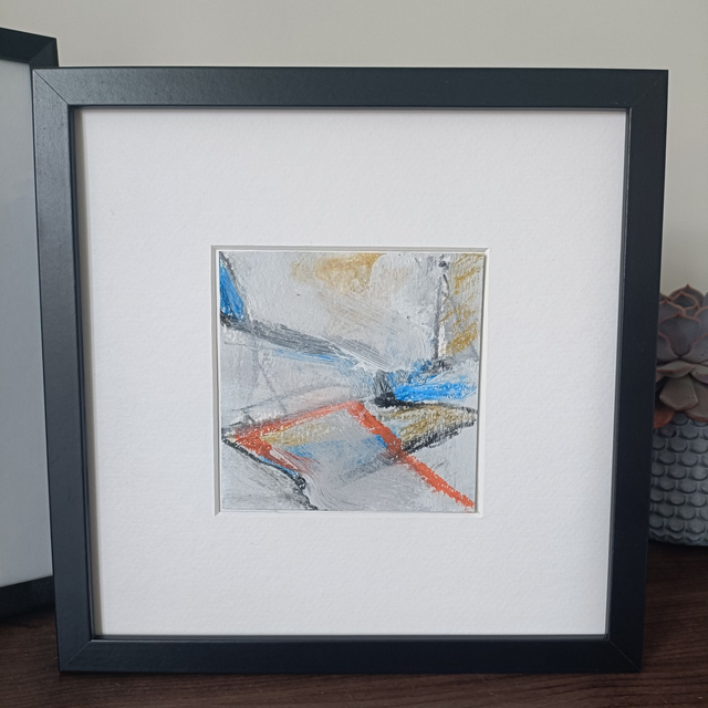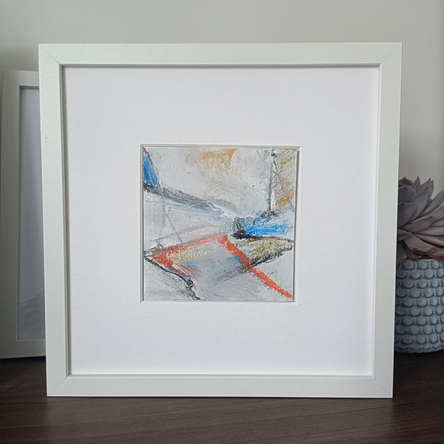 The painting is acrylic and oil stick on paper, mounted onto card and framed in this box frame, which can either be presented with the painting up to the surface of the frame or sat back 'in the box' using a 'spacer'. This is very easily changed at any time to suit your setting and choice.
